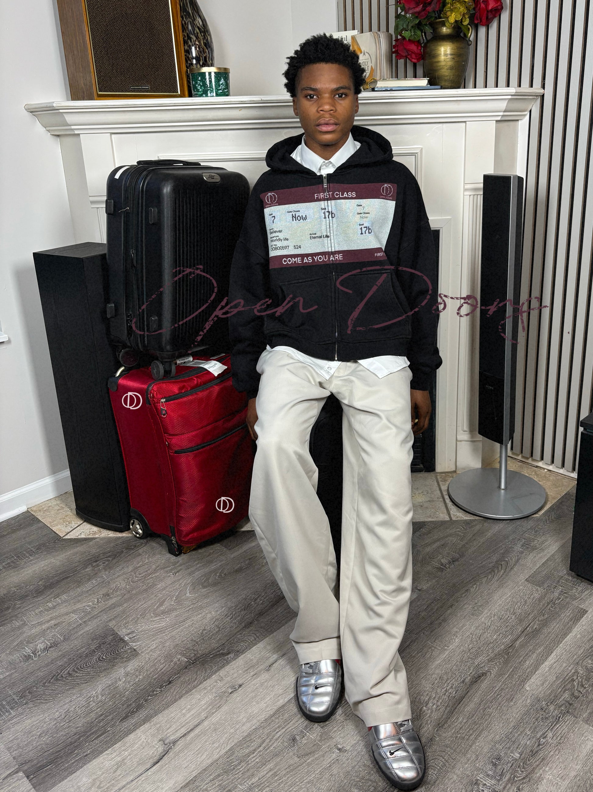 The front features a plane-ticket inspired design with a Christian spin, incorporating biblical words and symbols throughout. On the back, the piece is completed with the bold message: “THROUGH GOD EVERY DOOR SHALL BE OPENED.”