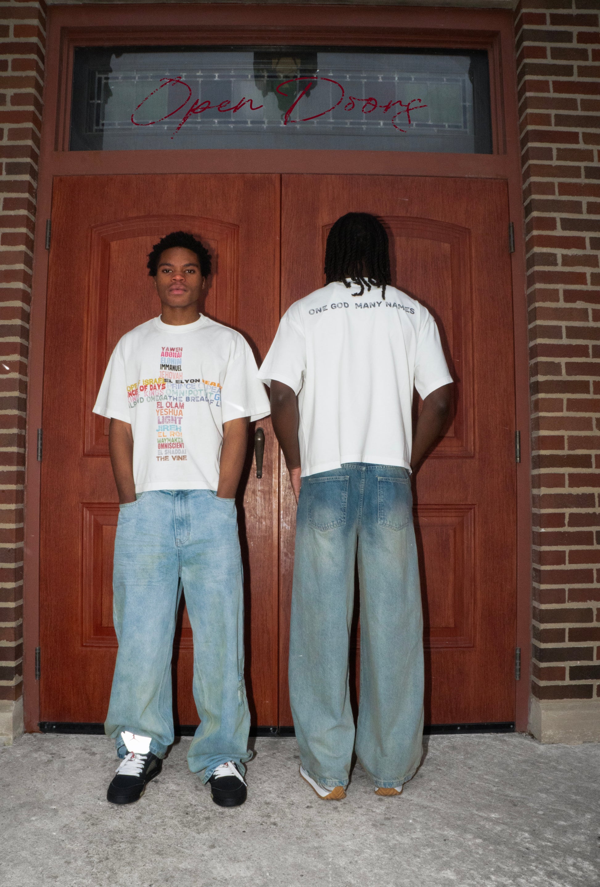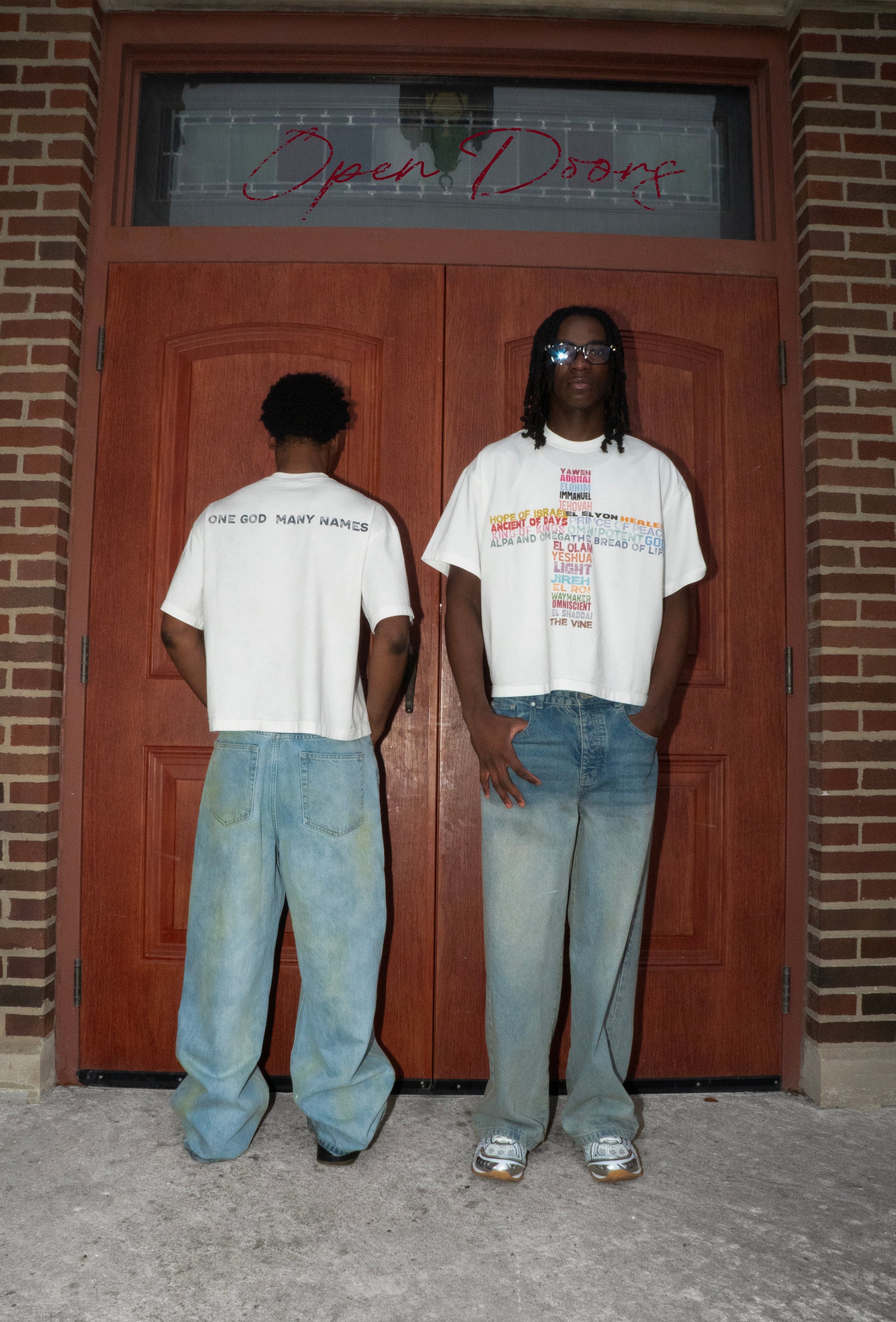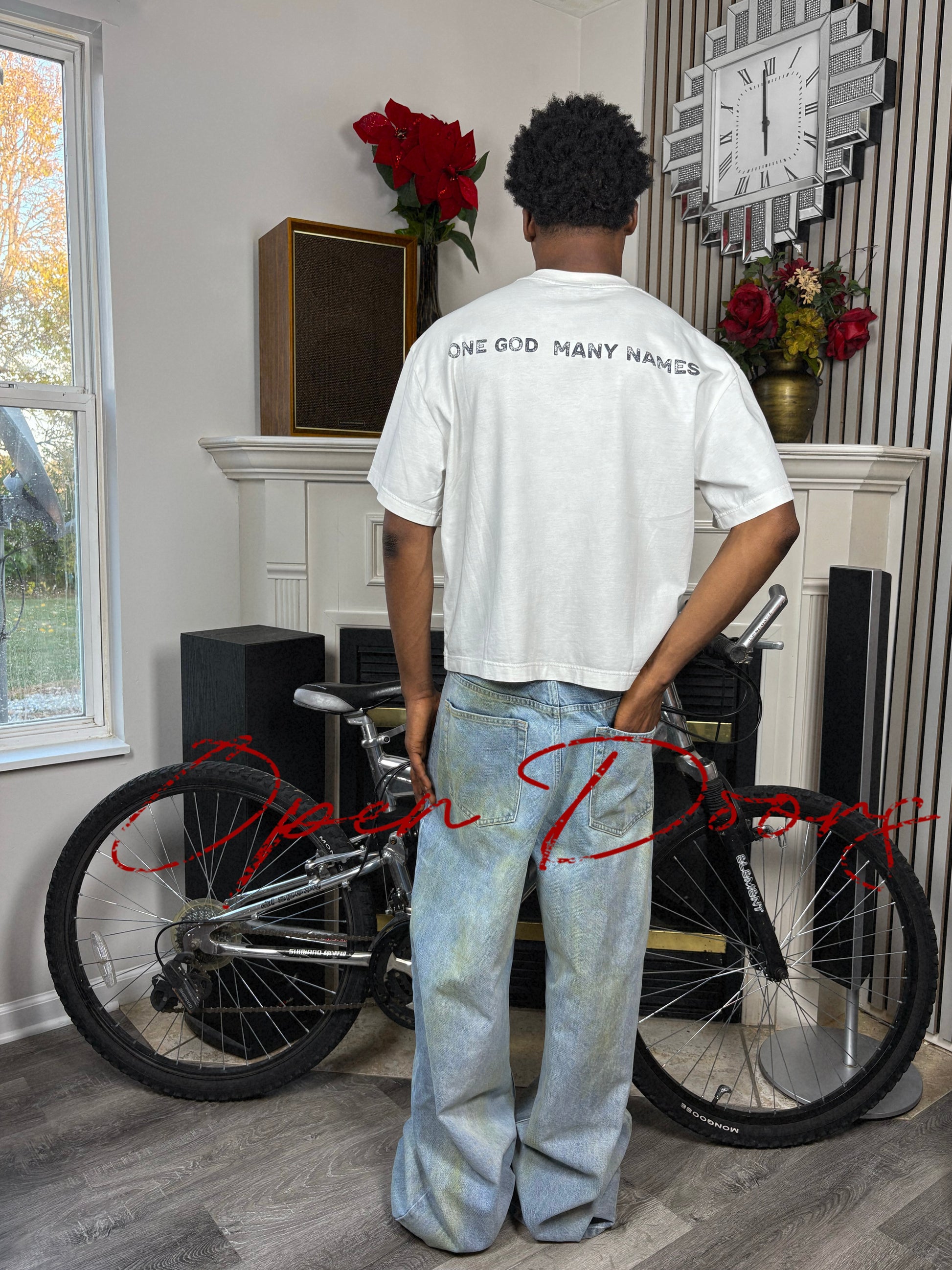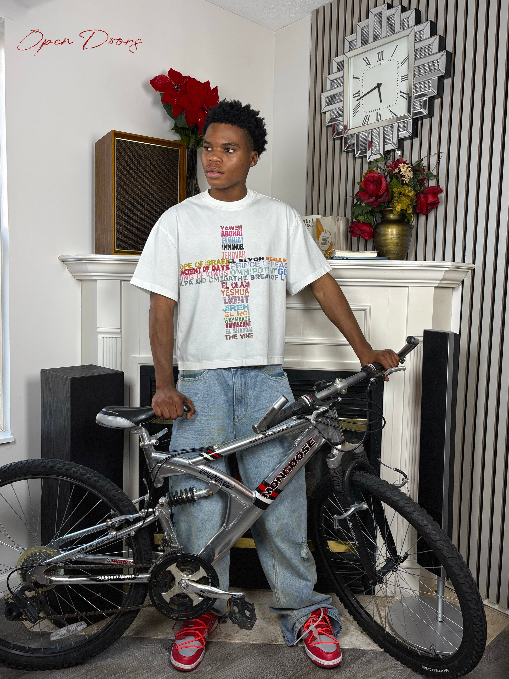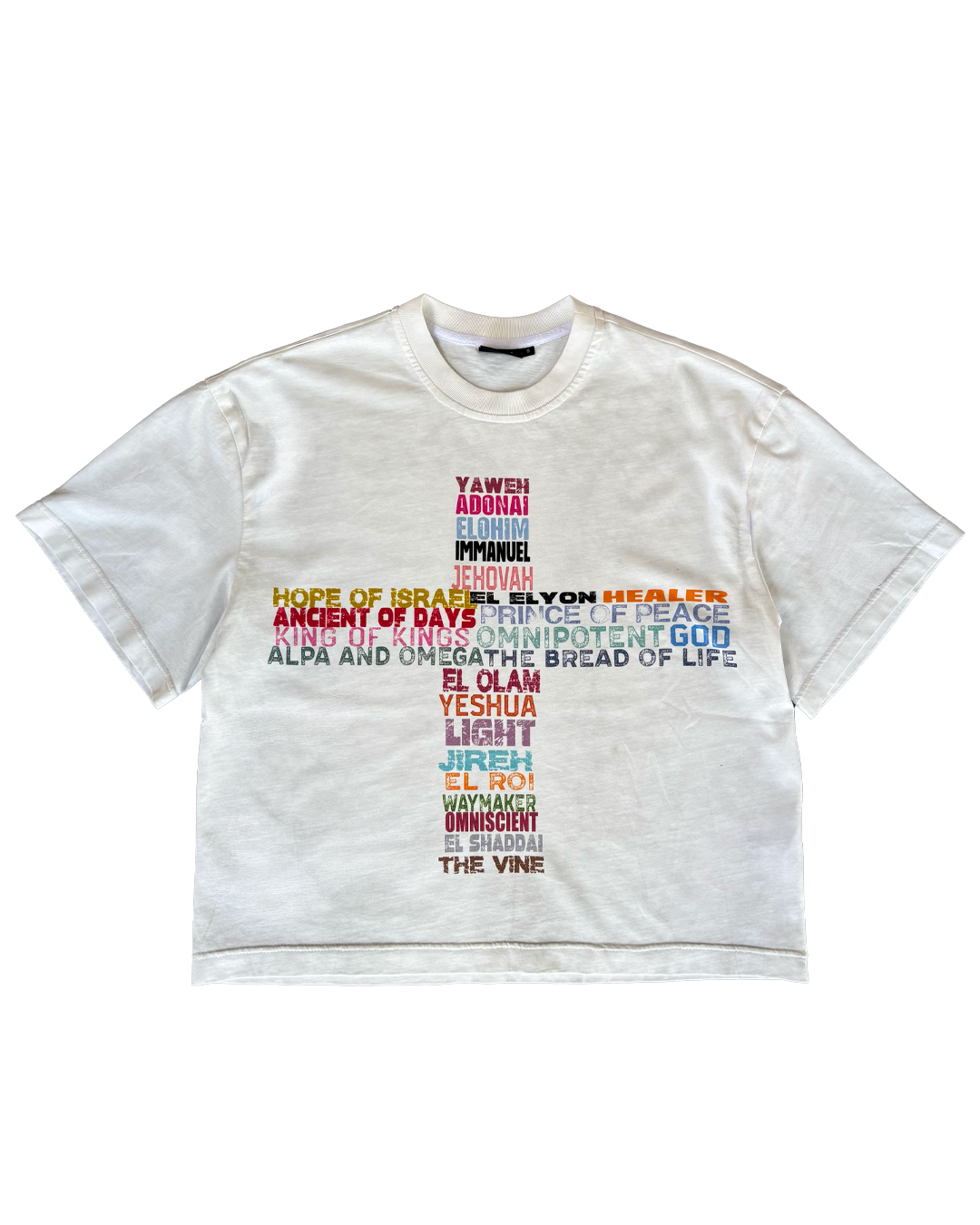 The front features a bold cross design built from God’s many names, displayed in different colors and fonts.